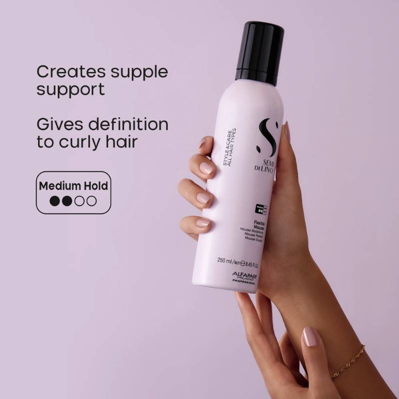 Flexible Mousse is workable mousse with a medium hold that is perfect for curly hair to create definition and as a base for more structured styles. Hair is defined but without the classic hard, crispy mousse feel.